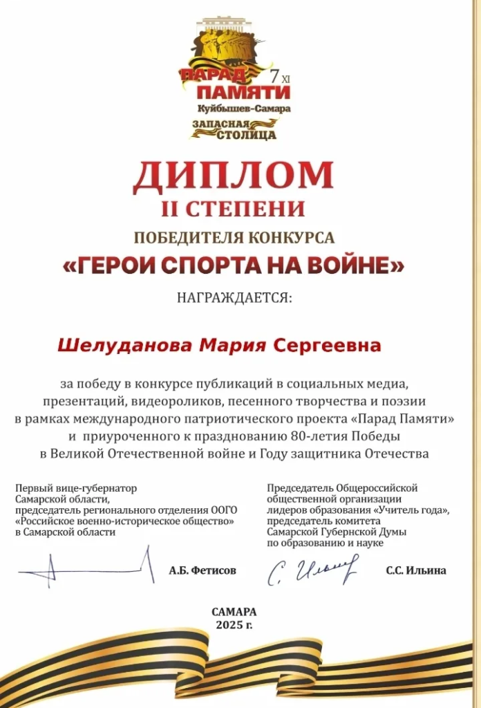 Конкурс «Герои спорта на войне» направлен на сохранение исторической памяти и воспитание чувства гордости за героев прошлого. Получив диплом за публикацию в социальных сетях, презентации, видеоролик, песню или стихотворение, Мария внесла значительный вклад в развитие патриотического воспитания молодежи.
